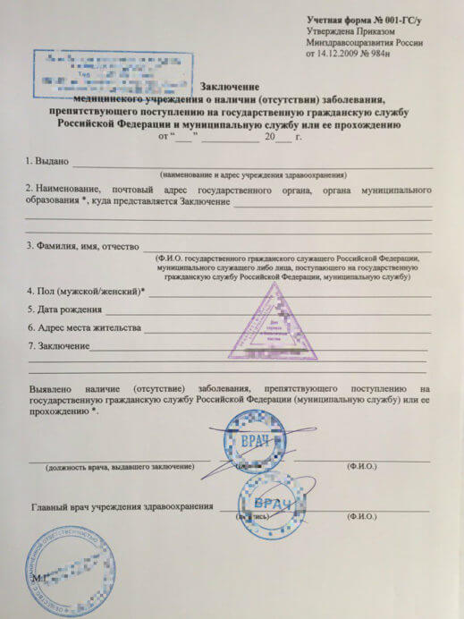 | Назначение | Справка подтверждает, что у соискателя нет серьезных болезней, которые могут препятствовать работе в государственных учреждениях или в муниципальных организациях. |