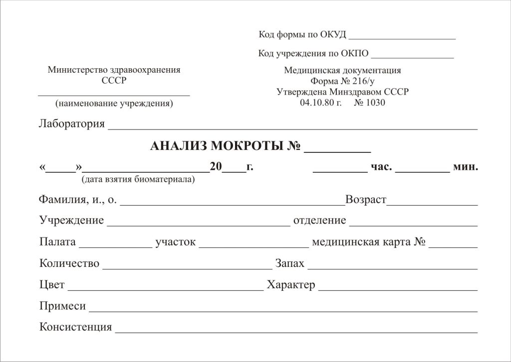 | Название справки | Справка об общем анализе мокроты 216/у |